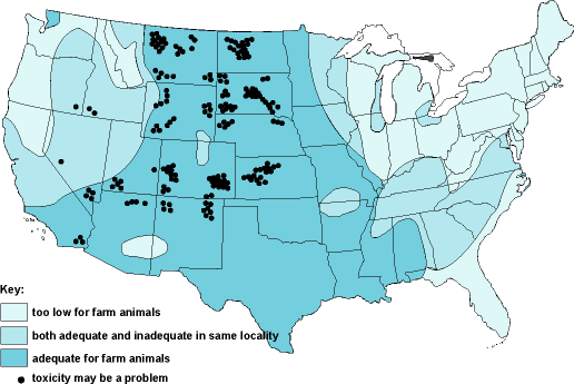 Much of North America, including western Oregon, does not have sufficient selenium in the soil for goats to naturally maintain a sufficient level to be healthy. Selenium toxicity from getting too much selenium can occur if they get too much, either by over-eating supplements or from the pasture itself in areas where the soil level is too high. Local extension agents or veterinarians can tell you about selenium levels in your area. Some parts of the country have variation in local soils that may be low, high, or even toxic.