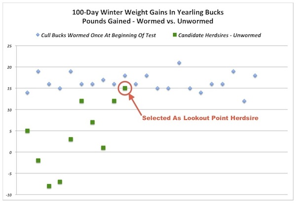 The below graph demonstrates the way that management inputs can mask genetic differences. During a recent 100-day wintertime test, cull bucks that received de-wormer performed uniformly well; almost all gained between 14 and 19 pounds. On the other hand, the performance of candidate herdsires that were not wormed fell across a much larger range, from a loss of 8 pounds to a gain of 15 pounds. If these candidate herdsires had been wormed, there would be no way to determine which buck had superior parasite tolerance.
