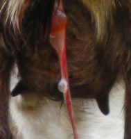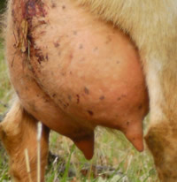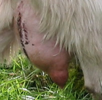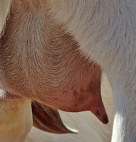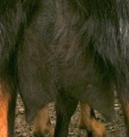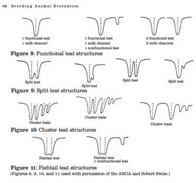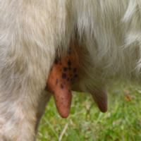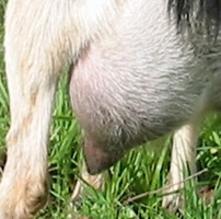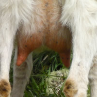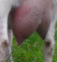OUR UDDER SCORING SYSTEMThe dairy influence of the Kiko breed provides the high milk production needed to wean large kids. Unfortunately, the typical dairy goat udder is not the ideal meat goat udder. Certain udder characteristics cause serious problems for low-input meat goat producers. While large, bulbous teats are not a problem for dairy producers, kids cannot nurse distended teats, and the management needed to milk out problem does is cost-prohibitive. Large, pendulous udders drag and catch on blackberries, inhibiting the does' search for food. Our farm is a proving grounds for udder quality. The nearby Willamette Valley floor produces much of the world's grass seed, as it is ideal for cool-weather grasses. However, our climate causes a springtime grass flush that boosts milk production, leading to blown udders in susceptible goats. 25% of our foundation animals had udder problems upon arrival here, despite having had no difficulties in their previous, drier California location. We insist on two clean teats only. We have heard the arguments for allowing a third or fourth extra teat to support multiple kids. However, in our experience, the limiting factor in raising multiples is total milk production, not number of teats. More importantly, extra teats appear to be strongly associated with teat defects such as split or fish teats. We have found that if a kid has even one small non-functional extra teat, there's more than a 50% chance that kid also has split or fish teat. It just doesn't seem feasible to breed for (or tolerate) three or four functional teats without also increasing teat defects. Through rigorous culling, we have dramatically increased the quality of our udders over the last 13 years. We score all does for udder at kidding. Herdsire dams have multi-year records of good udder performance under our conditions.
